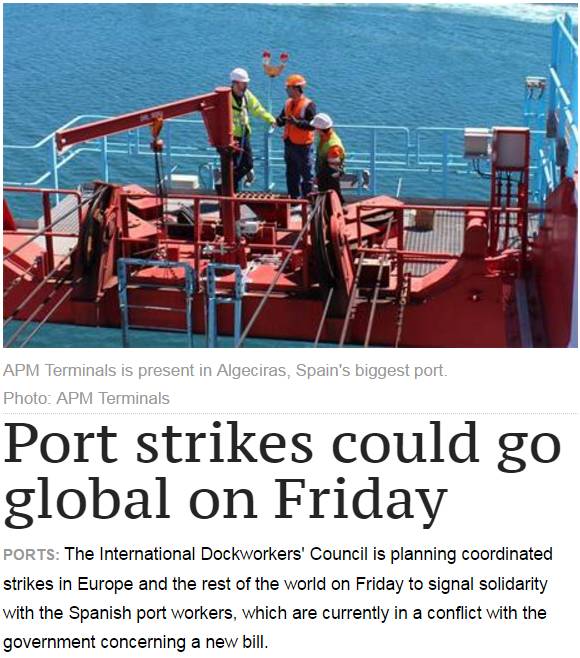全球的码头工人计划与西班牙的工人们团结起来,他们目前正在与西班牙政府发生冲突,政府计划实现西班牙港口的工人聘用自由化。